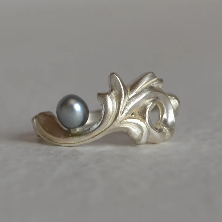 バロック様式とバロックパール(黒蝶ケシパール)を掛け合わせたデザイン 装飾的な指輪 ケシパールは一つ一つ形や色が異なるため実物と異なる場合がございます。 パールはこちらで選択させていただきますのでご了承ください。