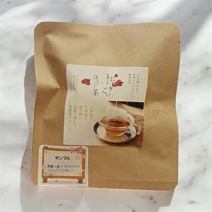 高麗人参チップスとほうじ茶葉TEAPACKに入れて飲みやすくしました。良質な高麗人参と国産ほうじ茶葉の香りを楽しみながら優雅に味わってみてはいかがでしょうか。高麗人参チップスだけでは独特の匂い味がありますがほうじ茶をプラスすることでまろやかに仕上げました。高麗人参の働きでは女性に最も多い美容関係のお悩みや、身体には回復力や抵抗力をつけたりと様々な特徴があり、ほうじ茶の働きとWで喜ばれそうです。。飲んだ後の高麗人参も充分栄養が残っていますので煮物と一緒に食べたり、もう一度乾燥させて粉にして飲みなおししたり、雑穀米などと一緒に炊き込むと独特の味もせず全部食べることができベストです。