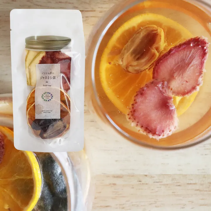 果実の彩りを、もっと身近に。 お湯を注ぐだけで、やさしい香りと自然な甘みが広がるノンシュガーフルーツティー。 ジャスミンの華やかな香りがやさしく立ちのぼり、 マンゴーのような黒糖の甘みを感じるまろやかな味わい。 果実の酸味と花の香りが調和し、すっきりとした余韻が残ります。 イチゴ・オレンジ(またはミカン)・リンゴ(国内産)、デーツ(国外産)のドライフルーツをブレンド。 砂糖・香料・保存料を一切使わず、果実がもつ甘みと香りをそのまま閉じ込めました。 おいしい飲み方 ① ドライフルーツとティーバッグをタンブラー等に入れる。 ② 約60℃に少し冷ましたお湯を300ml注ぐ。 ③ 10分以上蒸らすと香りと甘みが広がり、時間をかけるほど濃厚に。  半日ほどゆっくり飲むと、果実の甘さがより深く感じられます。 ④ 約200mlで濃いめに作り、氷を加えればアイスティーとしても爽やか。