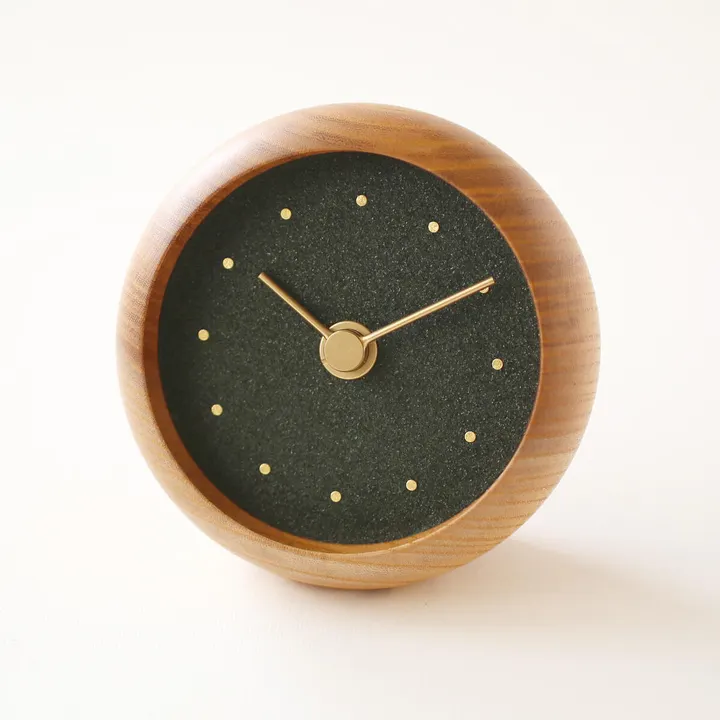 文字盤に「エジリン輝石」という鉱物を砕いた粉末(岩絵具)を塗りました。 粒子が粗く、光の当たり具合によりキラキラと繊細に輝きます。 本体は、漆器の産地として400年以上の歴史を持つ石川県加賀山中の「ろくろ引き」という、回転する木に鉋(カンナ)を当てて形作る方法で製作しました。 素材はケヤキで、木目が美しく、なめらかでしっとりとした質感です。 文字盤は、下地に金沢市二俣町で和紙作りをされている、石川まゆみさんに漉いていただいた和紙を使用し、 その上に天然石を砕いて作られる「岩絵具」を幾重にも塗り重ねています。インデックスは金沢の金箔です。 ■木の部分の色は、プレーン・ブラウン・ブラックの三色をご用意しております。 ■裏面カバーにオリジナルの刻印を入れることができます。(有料 +880円税込) ■受注生産のため、基本的にご注文いただいてから約2週間のお時間をいただきます。ご了承ください。 【時計部分の仕様】 ・日本製・1年保証・本体のサイズ:直径10cm厚さ5.4cm・使用電池:単3形乾電池 【付属品】 ・単3乾電池1個・取扱説明書1部・牛革製裏面カバー