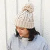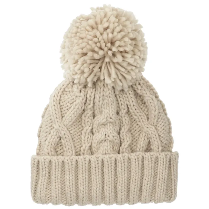 大きめのポンポンが付いたざっくり編みのケーブルニット帽。立体感のある網目模様と大きめのポンポン。小顔効果抜群。ウィンタースポーツにもおすすめのアイテム。