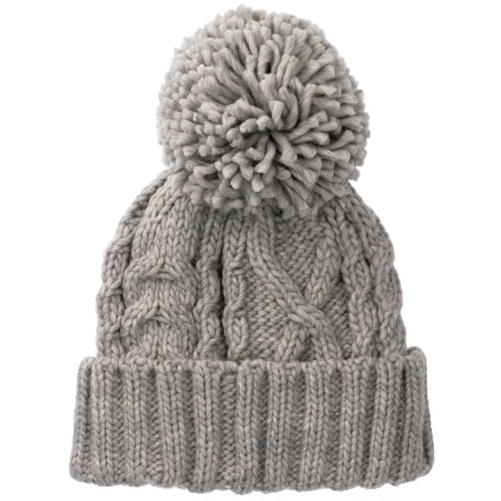 大きめのポンポンが付いたざっくり編みのケーブルニット帽。立体感のある網目模様と大きめのポンポン。小顔効果抜群。ウィンタースポーツにもおすすめのアイテム。