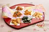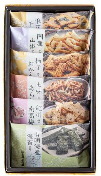 原材料の餅米は国産米100% 杵つき、せいろ蒸しなど昔ながらの製法にこだわっています。 多彩で奥深い味わいを6種類ご用意いたしました。 ■【梅ざらめ】  和歌山産南高梅をふんだんに使い、うす口醤油のあられにザラ目砂糖をふりかけています。 ■【山椒柿の種】  国産山椒を使った、柿の種。爽やかな香りと優しい辛さの柿の種です。 ■【醤油おかき】  大阪法善寺あられの自慢の品。四角い薄型の甘口醤油あられに国産の海苔を散らしています。 ■【七味あられ】  やさしい辛さの七味で仕上げた、小枝のようなあられです。七味の辛さがお口の中で後をひきます。 ■【磯辺】  佐賀県有明産の焼き海苔を贅沢に使いました。薄く焼いたあられが、海苔の香を際立たせます。 ■【柚子おかき】  天然柚子を使って、うまみを逃さず閉じ込め、柚子の風味がお口に広がります。