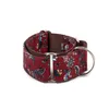 田園の風景に息づくナチュラルな魅力を取り入れたデザイン。 ボルドーカラーに華やかな装飾花柄をあしらった首輪で、愛犬との散歩をもっとスタイリッシュに。 牧歌的なプリントとフォークスタイルが、自然と都会を美しく融合させます。 ? マーチンゲールカラー 幅が4cm、5cmと通常よりもかなり広めに出来ております。頭と首が細長く通常の首輪では抜けてしまうハウンド犬種に、特にぴったりのハーフチョークタイプです。? ハウンド系犬種以外でも幅広くお使い頂けます。頭からかぶせて着用するので、頭のサイズも合わせてご確認ください。