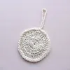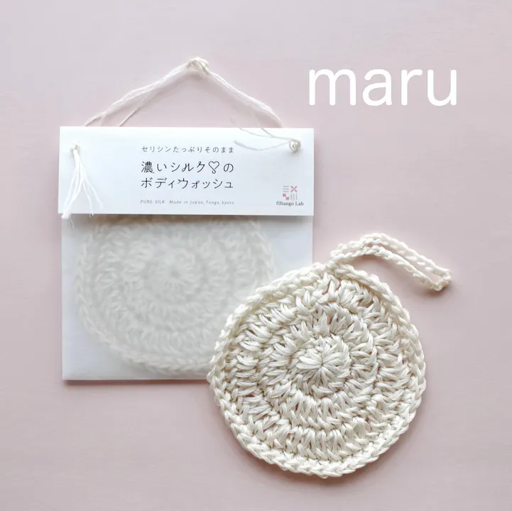 お風呂時間に、毎日の手洗いに!絹の成分 ”セリシン” がたっぷりのボディウォッシュ。 <まる maru>は、手のひらにすっぽり収まるサイズシンプルな形は男性にも人気です。ひとつづつ手編みのため、サイズに少しばらつきがあります。 【使用方法】 普段お使いの石鹸やボディソープとともにお使いください。使用後はよく洗って絞って、吊るして乾かしてください。時々、洗濯して天日干しするのがおすすめです。素材は天然の素材のみで作られています。防かび剤などの化学物質は一切使用しておりません。 【商品の特徴やものづくり背景】 京都、丹後、創業100年の高級和装織物の丹後ちりめんをつくる工場での製造過程で絹の原料の蚕、繭にもともとついているセリシンという美肌成分を、加工により充分に引き出して糸をつくっています。セリシンを残したままで作られた糸、というのが商品の最大の特徴で、他社ではできない。もちろんシルク100%、天然素材そのまま、シルクは人間の肌と同じタンパク質からできています。商品は、編み物が得意な丹後在住の高齢者の方が一つ一つ編んでいます。触るとセリシンの風合いでシャリシャリしていますが、お湯につけると柔らかくなります。繭から引き出した極細のシルクの糸が150本あまり束ねられているので、泡立ちもよく、繊維が肌の細かい部分に行き届き、角質を落とします。