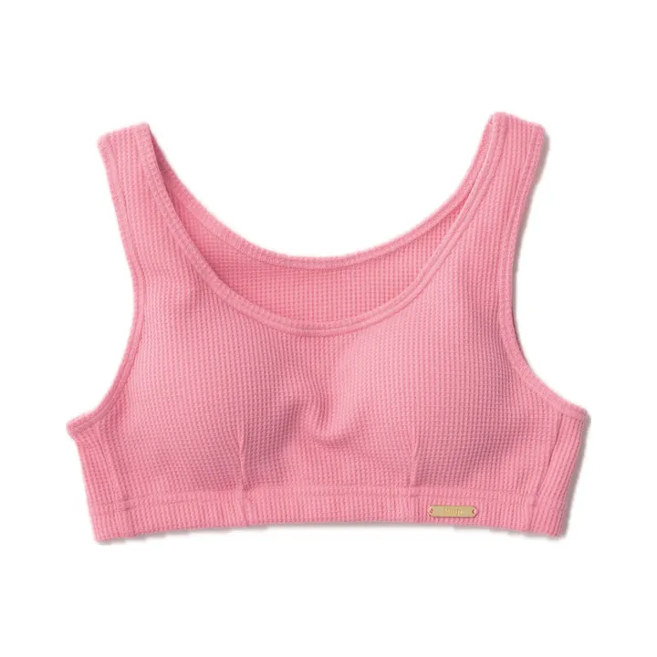 お休みの日や家でゆっくりとしたい時にぴったりなハーフトップ。 締め付けが少なく、ゆるっと楽に着られるので、身体をリラックスさせて過ごすことができます。 Cuip ズボパンと合わせて、ルームウェアとしてご利用ください。 胸元がしっかり隠れ、肩紐部分も太めのデザインになっているので、くいこみにくく、安定感のある着心地に。 パッドは取り外し可能なので、お好みのものとの入れ替え、自分にフィットしやすく着られます。 身生地に使用している生地は、ワッフルのようにマス目状の凸凹のある生地で、やわらかく、身体を包み込んでくれるような優しい肌触りです。