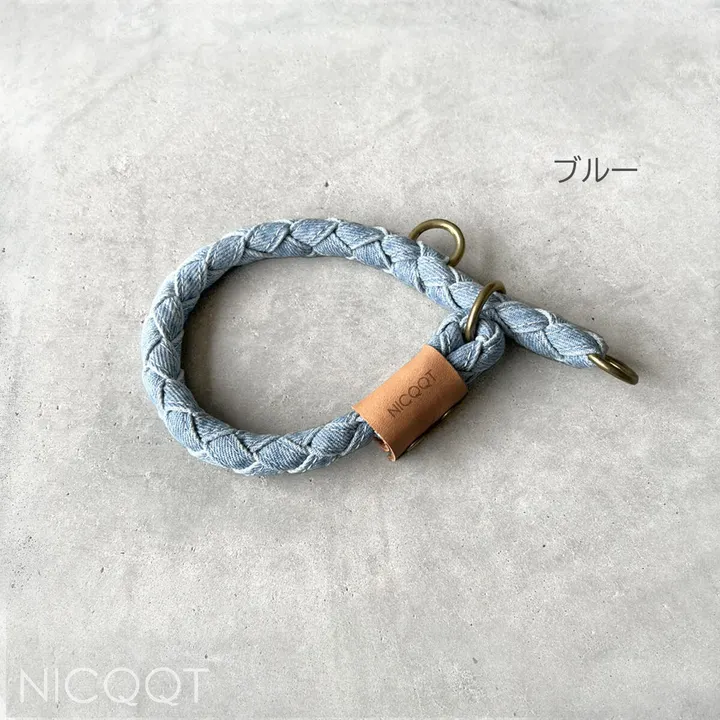 デニムで編んだハーフチョークカラー。 デニムパンツのベルトループをNICQQT用に製作し丸編みで筒状に編み上げました。 筒状に丸く編んでいるため、 柔らかくソフトな肌触りとなっております。 デニムとヌメ革の組み合わせは、どんなワンちゃんにも飼い主さんにも合う、シンプルなデザインです。  *ハーフチョークカラーとは 頭からスッポリはめるだけの扱いやすい首輪です。 首輪につけたリードを引っ張ると首輪がしまる構造になっているので、首輪抜けひっぱり対策にも有効的です。 一定以上締め付けられないようにリングを付けているので、首輪を締めすぎて気管を傷める心配が少なくなっています。 *現在仕様変更中となっております。 新バージョンは ・デニムステッチカラー:黄色→デニム同色 ・革タグ部分:縫い付け取り外し不可→金物ボタンにて取り外し可能 ご注文のタイミングで旧バージョンと新バージョンになる可能性がございます。 ご希望がございましたら、注文時にメッセージをお願いいたします。