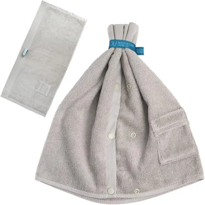 【サウナも銭湯もこれ一枚】タオルとサウナハットの機能を持ち合わせているので、1枚2役で荷物を減らせます。革新的な多機能タオルサウナハットです。 【細部にまでこだわったディテール】ゴムバンドの上端部は糸が出にくい工夫で、ゴムで留めることでしっかり密閉できます。また、ずらして使用することで視界も確保でき、タオル素材なのでしっかり汗も拭えます。 【組み立ても簡単3ステップ】①端っこのスナップボタンを留める。②上端にプリーツをつくる。③付いているゴムバンドで束ねて完成。長い髪の毛もしっかり収納できます。