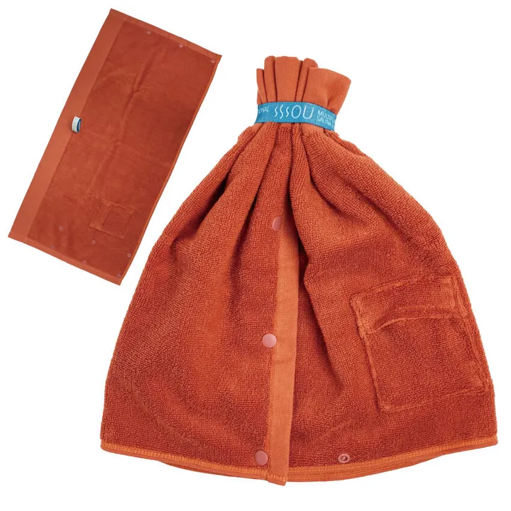 【サウナも銭湯もこれ一枚】タオルとサウナハットの機能を持ち合わせているので、1枚2役で荷物を減らせます。革新的な多機能タオルサウナハットです。 【細部にまでこだわったディテール】ゴムバンドの上端部は糸が出にくい工夫で、ゴムで留めることでしっかり密閉できます。また、ずらして使用することで視界も確保でき、タオル素材なのでしっかり汗も拭えます。 【組み立ても簡単3ステップ】①端っこのスナップボタンを留める。②上端にプリーツをつくる。③付いているゴムバンドで束ねて完成。長い髪の毛もしっかり収納できます。
