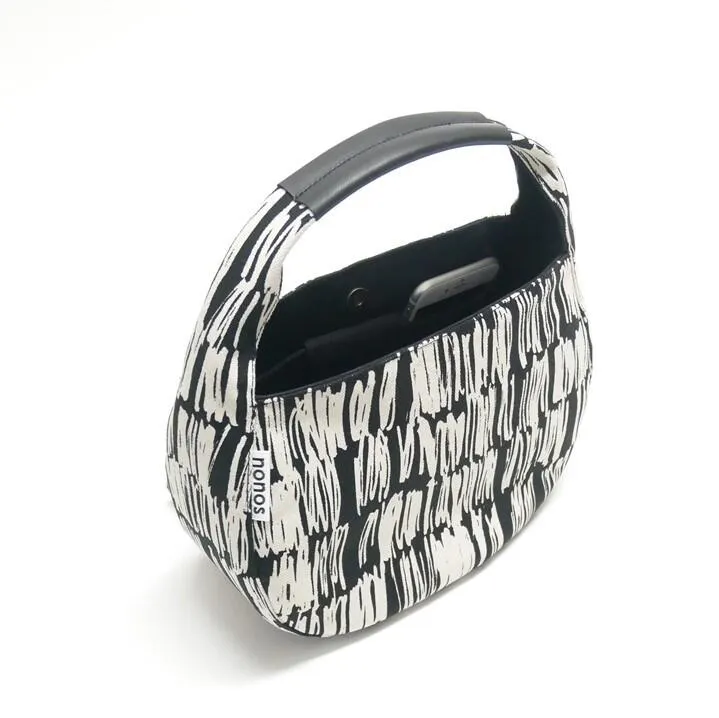 モノトーンの手描き柄はどこか懐かしく暖かみを感じます。そのオリジナル手描き柄プリントの帆布で作られたミニバッグ。バッグの丸いデザインと優しい手描き柄が重なり合い「カジュアルかわいい」バッグが出来ました。ちょっとしたお出掛けに、サブバッグに、気分が上がるミニバッグです。 外側はプリント帆布、内側は無地帆布、外内二重の帆布使いでしっかり自立出来るタイプです。持ち手部分には革を巻き上質感とおしゃれ感をトッピング、汚れ防止効果にもなっています。バッグの口元はマグネット釦付きで閉じる事が出来ます。内側にはマジックテープ付きのポケットとパスケースや鍵を固定出来るDカンが付いています。 いつまでも使い続けて欲しい、変わっていく風合いを楽しんで欲しい、そんな思いから日本製に拘りました。 <サイズ> W : 24cm H : 19cm (持ち手部分は含まない) D : 10cm (底部分) 持ち手の長さ : 33cm 重さ : 約200g <仕様> 本体 : 帆布二重仕立て ハンドル : 革巻き 開閉口 : マグネットボタン 内側 : ポケット(マジックテープ付き)×1 Dカン×1 肩掛け : 不可 B5収納 : 不可 <素材> 表地 : 綿100% 富士金梅 8号帆布 プリント加工(千葉/松戸 FACTORY) 裏地 : 綿100% 富士金梅 8号帆布 持ち手 : 牛革 姫路 LEATHER <縫製> 日本製(東京/ATELIER) ※商品により柄の出方が違う場合があります。 ※濡れたものと強く擦ると希に色落ちする場合がありますのでご注意ください。 ※商品写真はできる限り実物の色に近づけるよう徹底しておりますが、 お使いのモニター設定、お部屋の照明等により実際の商品と色味が異なる場合がございます。