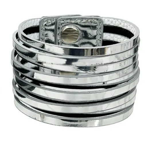 長さの違う革のテープが幾重にも重なった波のような立体的なデザイン 上質な山羊革と牛革のリバーシブル・ラップブレスレット 軽やかさを追求したミニマルなデザインに、メタリックな輝きが 上品なアクセントを添えます。柔らかくしなやかな革が、 腕に心地よくフィットし、一日中快適につけられる付け心地も魅力です。 3シリーズの中で、一番広いタイプになります。 13Line タイプ 色の組み合わせ 選択可能 メタリック 3colors シュリンク 6colors *ご注文の際に、牛革の色のご指定をお願いいたします。