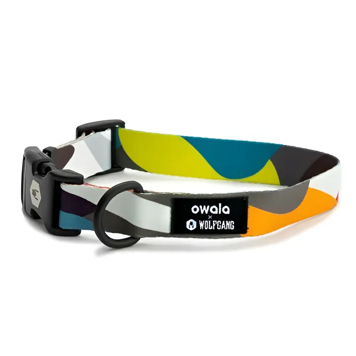 犬用の首輪。 Owalaの美しいウォーターボトルからインスピレーションを得たデザインです。 WOLFGANG MAN & BEAST のリードやカラー(首輪)は、車のシートベルトなどにも使われる、強度と柔らかさ、耐久性を兼ね備えたポリエステル100%のウェビング素材を使用しています。 水を吸い込まない、極細のポリエステル糸を非常に密に編むことによって、海や川でも使用可能、汚れや臭いもつきにくい特徴があります。 さらに、ウォッシャブルで洗濯も可能。 アウトドアでの使用にもピッタリです。 製法には、ウェルディング製法( 生地を熱で溶かすことによって生地同士を接着し、強い耐久性を実現する溶着製法 )を採用。 糸による縫い目が無いので、飼い主・愛犬にとって快適な使い心地を実現。通常の縫製による擦れからの糸のほつれが生じることがありません。   WOLFGANG MAN & BEAST のすべてのドッグプロダクトは、こだわりのアメリカンメイド。 ドッグプロダクトは、大切なパートナーである愛犬が、長年愛用できるものであってほしい。 その思いから、選び抜かれた素材を使い、品質にこだわり、WOLFGANG MAN & BEASTのすべてのドッグプロダクトはアメリカ国内で生産されています。 <Sサイズ:対応犬種の目安> ジャック・ラッセル・テリア/パピヨン/マルチーズ/シーズー/ヨークシャーテリア/キャバリア/ホワイト・テリア/ミニチュア・ダックス ...etc <Mサイズ:対応犬種の目安> パグ/コッカスパニエル/シュナウザー/ボストンテリア/フレンチブルドッグ/オーストラリアン・キャトル・ドッグ/スタッフォードシャー・ブル・テリア/ブリタニー/サルーキ/ビーグル/柴犬/ダルメシアン/ウェルシュ・コーギー/ボーダー・コリー ...etc <Lサイズ:対応犬種の目安> ボクサー/ゴールデンレトリバー/ジャーマン・シェパード/ロットワイラー/シベリアン・ハスキー/ブルドッグ/コリー/アメリカン・ピットブル・テリア ...etc 上記の犬種はあくまで目安です。個体によりサイズは変わりますので、購入前に必ず愛犬の実際のサイズを計測して適合サイズを確認してください。