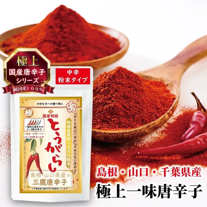 【原材料・成分】唐辛子(島根・山口・千葉県) 【内容量】20g×1袋入り 【賞味期限】365日 【商品情報】 【純国産100%の極上一味唐辛子】香り・旨味・辛さが揃った三鷹唐辛子使用。風味豊かで料理にコクをプラス! 【選べる3段階の辛さ】ピリ辛・中辛・大辛から選べる!好みの辛さで料理に刺激をプラス! 【パウダーと粗挽きの2タイプ】料理に合わせてパウダータイプと粗挽きタイプを使い分け可能! 【パウダータイプの特徴】旨味と辛さが瞬時に広がる!炒め物・カレー・汁物におすすめ。 【粗挽きタイプの特徴】旨味と辛さが後からじわじわ!焼き鳥・ピザ・ステーキにおすすめ。 【粉末+粗挽きで深みのある辛味】2種を組み合わせることで、まろやかで奥深い辛味を演出! 【無添加・食塩不使用】素材本来の味わいを楽しめる!毎日の食事に安心して使える一味唐辛子。 【カプサイシン効果でぽかぽか】体を内側から温める!寒い季節にぴったりの調味料。 【贈り物にも最適◎】料理好きや特別な日のプレゼントに喜ばれる極上一味唐辛子!