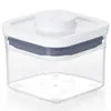 """魅せる収納""で人気のポップコンテナ フタの真ん中についているボタンを押すだけで開閉ができ、ポップアップしたボタンはそのままハンドルとして使えるドライフード用の保存容器です。調理中や、片手がふさがっていても、ワンタッチ操作で密閉が可能です。 フタの形はミニスクエア、スモールスクエア、ビッグスクエア、スリムレクタングル、レクタングルの5種類。高さは小さいほうから順にミニ、ショート、ミディアム、トールの4種類です。 高さはミニを基準にミニの2倍がショート、3倍がミディアム、4倍がトールと全てのフタの形に共通しているので、カウンターや戸棚の中でスッキリ整理整頓ができます。サイズ違いでもきれいにスタッキング(積み重ねて収納)ができます。 スクエア形状の容器は省スペースで収納できるだけでなく、掴みやすく、角から中身を注ぎやすいのも特徴です。毎日使うものだからこそ、使い勝手の良さを追求した保存容器です。 また、ポップコンテナに合わせてお使いいただける各種アクセサリーもあります(別売り)。フタの裏に装着して収納できるので、別にスプーンを用意したり、コンテナの中で埋まって見えなくなってしまうこともありません。 ポップコンテナは全部で18サイズありますので、入れるものの量や形にあわせてお選びください。フタは内側のパーツを取り外してお手入れが可能です。ボタンのついているフタ以外は漂白剤がご使用いただけます。すべてのパーツは食器洗い乾燥機(低温設定)がご使用いただけます。 適合アクセサリータイプ: ポップスクープ / コーヒースクープ / 粉ふるいスクープ / ライスカップ / シュガーキーパー"