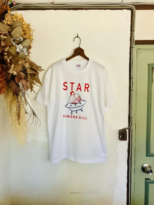 夏ティーシャツ◎ジョンさん宇宙へ行く① ALMOND HILLの描きおろしです。 「丁寧に刷り上げられた1点物のハンドメイドTシャツ。」 シルクスクリーン印刷で1枚1枚手作業で丁寧に刷り上げられたTシャツは、同じデザインでもそれぞれ異なる風合いを出します。Tシャツに直接インクを刷り込むので、プリントTシャツよりも丈夫で色落ちがしにくいのも魅力の一つです。 5.6オンス生地は程よい厚みでザラつき過ぎず、薄すぎない丁度よい厚みでごさいます。 アイロンをかける際は、プリント部分はあて布をして下さい。 ドライクリーニングや、乾燥機のご使用、漂白は避けてください。