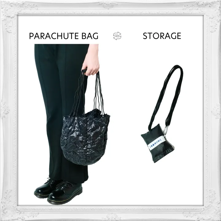 空を駆けるパラシュートからインスピレーションを受けた、進化するエコバッグ。 軽やかさと防水性を兼ね備えた耐久性素材を採用し、折りたたみ可能なコンパクトサイズで日常を彩ります。 本体と収納袋が一体化した設計により、煩雑な手間を省き、収納は大胆に。 バネ口を開けば、無造作なシワが立体的な表情を生み出し、独特な美しさを持ちます。 ハンドルには弾力のあるシリコンホースを配し、手への負担を軽減。 一方で、複数本のナイロン製パラコードが細身ながら驚異的な強度を誇り、無駄を削ぎ落としたエッセンスを感じさせます。 素材の選定からギミックに至るまで、パラシュートの概念を追求し、 CHIDORIのアイデンティティを具現化したバッグです。