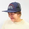 ナイロン素材のトラッカーキャップ。前立ての芯を抜きUSED感を出しました。