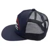 ナイロン素材のトラッカーキャップ。前立ての芯を抜きUSED感を出しました。