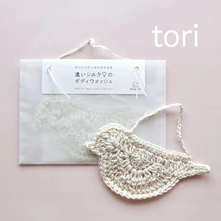 お風呂時間に、毎日の手洗いに! 絹の成分 ”セリシン” がたっぷりのボディウォッシュ。 <鳥 tori>は洗面所やお風呂に吊るして癒される時間を与えてくれるようなデザイン。 【使用方法】 普段お使いの石鹸やボディソープとともにお使いください。使用後はよく洗って絞って、吊るして乾かしてください。時々、洗濯して天日干しするのがおすすめです。素材は天然の素材のみで作られています。防かび剤などの化学物質は一切使用しておりません。 【商品の特徴やものづくり背景】 京都、丹後、創業100年の高級和装織物の丹後ちりめんをつくる工場での製造過程で絹の原料の蚕、繭にもともとついているセリシンという美肌成分を、加工により充分に引き出して糸をつくっています。セリシンを残したままで作られた糸、というのが商品の最大の特徴で、他社ではできない技術。もちろんシルク100%、天然素材そのまま、シルクは人間の肌と同じタンパク質からできています。商品は、編み物が得意な丹後在住の高齢者の方が一つ一つ編んでいます。触るとセリシンの風合いでシャリシャリしていますが、お湯につけると柔らかくなります。繭から引き出した極細のシルクの糸が150本あまり束ねられているので、泡立ちもよく、繊維が肌の細かい部分に行き届き、角質を落とします。