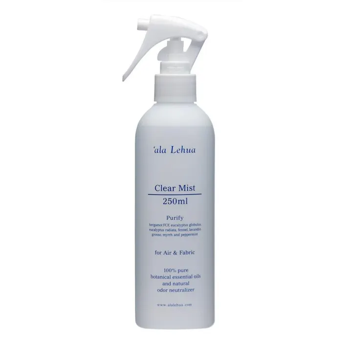 ※価格改定:2024年4月1日出荷分より価格改定いたしました。 ■心地よく香る「クリアミスト」 Clear Mist for Air & Fabric 250ml 99%以上天然由来のやさしい成分からできた消臭除菌機能付きのエア&ファブリックミストです。イチョウやイチジクなどの植物から抽出された高濃度のポリフェノールとグレープフルーツ種子から抽出したエキス、そして精油成分が帽子や洋服、ベッドリネン、タオル、カーテンなどの布製品についた気になるニオイ成分に反応。不快なニオイを元から消臭・除菌します。また布製品だけでなく、トイレやキッチン、お部屋などの空間消臭としてあらゆる生活シーンで使用できます。 -------------------------------------------------- ●99%以上天然由来成分 (パラベン、シリコン、合成色素、合成香料、鉱物油、石油系界面活性剤、石油系乳化剤)不使用 ●植物由来の消臭除菌成分 植物由来高濃度ポリフェノール、グレープフルーツ種子エキス 【香りラインナップ】  -Calm(カーム)-  ハワイの咲き誇る花々をイメージした、濃厚で甘いロマンティックなフローラルブレンド。女性らしさを呼び覚まし温かな幸福感をもたらします。また感情の混乱を和らげ、気持ちをゆったりとリラックスさせます。  <配合精油>スイートオレンジ、パルマローザ、イランイラン、ジャスミンabs.、ベンゾイン、シナモンリーフ  -Revive(リヴァイブ)-  ハワイの輝く太陽をイメージした、心も身体も軽やかになる爽やかなフルーティーブレンド。不安や緊張を和らげ落ち着きを取り戻し、バランスを整えながら気持ちを元気に明るくします。  <配合精油>ベルガモットFCF、ゼラニウム、フランキンセンス、マジョラムスイート、ラベンダー・フランス   -Purify(ピュリファイ)-  ハワイの自然をイメージした、爽やかな海風が吹き抜けるオーシャンブレンド。意識をクリアにし集中力を高め、気持ちをすっきり軽やかにします。  <配合精油>ベルガモットFCF、ユーカリ・グロブルス、ユーカリ・ラディアータ、ミルラ、フェンネル、ペパーミント、ラバンディン・グロッソ -Arbor(アーバー)-  ハワイの木陰をイメージした、心地よい光と風を感じるフルーティーグリーンブレンド。昂ぶった心に落ち着きを取り戻し、リフレッシュさせ気持ちを明るく前向きにしてくれます。  <配合精油>ライム、メイチャン(リュツアクベバ)、フランキンセンス、ユーカリ・ラディアータ、サイプレス、マジョラム・スイート、シダーウッド、ラバンディン、サンダルウッド