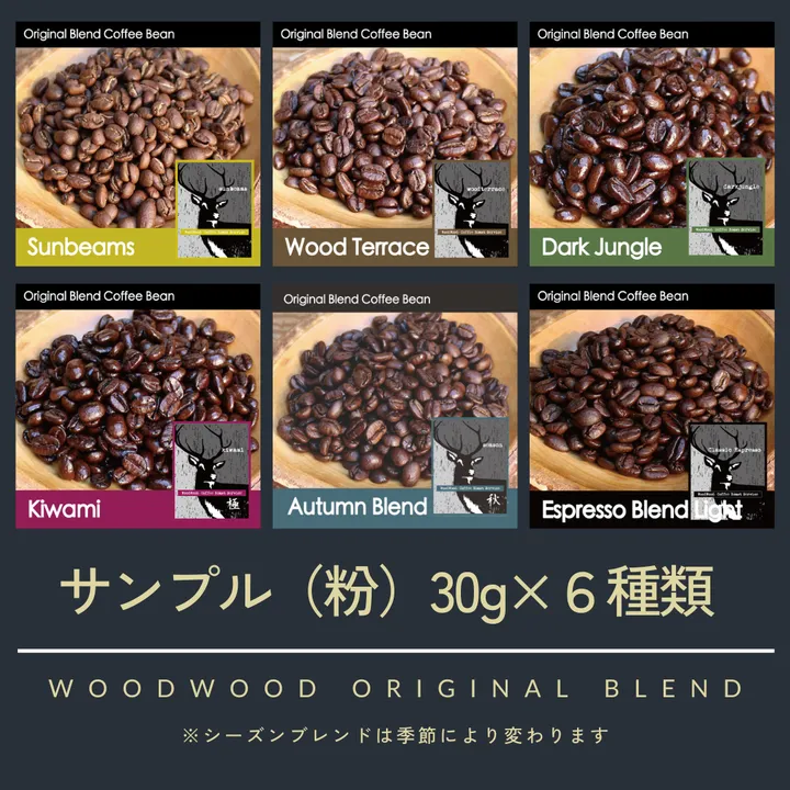 (粉)ペーパードリップ用に挽きます エスプレッソブレンドは、エスプレッソ用に極細挽きにします ・Sunbeamsサンビームス ・Woodterraceウッドテラス ・Darkjungleダークジャングル ・極 Kiwami ・Classic Espresso Blend Lightクラシックエスプレッソブレンドライト ・Season シーズン シーズンブレンドは、季節により変わります。 春:3月〜5月/夏:6月〜8月/秋:9月〜11月/冬:12月〜2月