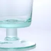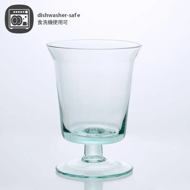 再生ガラスで作られたシンプルな脚付きのカップです。 飲み物だけでなく、ヨーグルトやコーヒーゼリー、小さなパフェなどのデザートの器として相性◎。 大きすぎないサイズ感は、普段使いに最適です。 リューズガラスとは、再利用されたガラスのことをいいます。一般的には「リサイクルガラス」や「再生ガラス」とも呼ばれ、一度は捨てられたり不要になったガラスをリサイクルして使っています。そのためリューズガラスは、環境にやさしいサスティナブル(Sustainable=持続可能)な社会への取り組みとしても注目されています。リューズガラス製品は、ひとつひとつが職人たちの手によるハンドメイド。炉で溶かしたガラスを竿ですくい取り、型の中で息を吹き込みながら作る「型吹き成形」という技法で作られていますので、たとえ同じ型のシリーズであっても、全く同じ仕上がりになるということはありません。ハンドメイドならではの、ガラス表面に生まれるわずかな“しわ”や小さな気泡、繊細な表情の違いなどをお楽しみいただけると思います。さらにリューズガラスの風合いは、無機質な印象になりがちなガラス製品に独特のあたたかみや素朴さをもたらしてくれます。吹きガラスならではの、やや薄くて軽い作りも魅力のひとつです。