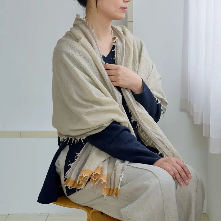 織り上げたストールをお湯で洗って縮ませるボイルドウォッシュ加工を施し、厚みと柔らかさをプラスしました。職人が収縮具合を確認しながら洗いをかけ縮ませているので、一つひとつのサイズ感や表情が微妙に異なるのも魅力のひとつです。 ウールは暖かく吸水性、吸湿性に優れた天然素材です。水をはじく性質を持ちつつ湿気をよく吸収します。汗をかいても湿った感じが少ないため、快適に着用出来ます。また、弾力性があり、型崩れしにくい素材です。 この製品は、日焼け、汗や水に濡れた場合の摩擦により、他の物への色移りや変色する場合がありますのでご注意ください。素材の特性上、色落ちと縮む事がありますので、洗濯の際はネットに入れて他の物と一緒に洗わないでください。蛍光増白剤・漂白剤入りの洗剤は使用しないでください。長時間水に浸けておいたり、濡れたまま放置しないでください。タンブラー乾燥は避け、自然乾燥してください。 *モデル身長167cm