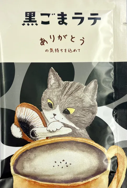 豊かな黒ゴマの風味広がる「黒ごまラテ」 香ばしさとクリーミーな風味が寄り添う、「黒ごまラテ」。黒ごまパウダーときな粉を使用した香ばしい香りとまろやかな口当たりが楽しめる和テイストのラテです。 ミルクや豆乳を注いでいただき、日々のリラックスタイムにぴったりの一杯としてお楽しみいただけます。 また、個包装のパッケージは「ありがとう」のメッセージ付きで、プチギフトなどの贈り物としても、お使いいただけます。