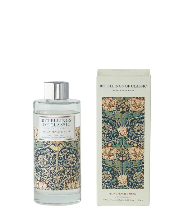〇RETELLINGS OF CLASSIC リテリングスオブクラシック Art by William Morris 「モダンデザインの父」と呼ばれる「アーツ・アンド・クラフツ運動」の先駆者、ウィリアム・モリスの代表的なボタニカルデザインを用いたフレグランスシリーズ。 【ウィリアム・モリス(William Morris、 1834 年 3 月 24 日 - 1896 年 10 月 3 日)】19 世紀イギリスのテキスタイルデザイナー、詩人、ファンタジー作家、アーティスト(作家)、印刷者、翻訳家、建築保護運動家、社会主義活動家。多方面に関わるアーツ・アンド・クラフツ運動主導者。彼の残した名言で、「役に立たないものや、美しいとは思わないものを、家に置いてはならない」があります。 ▶ウィリアム・モリスのデザインモチーフを用いたリテリングスオブクラシックは、細部までこだわったフレグランスアイテムと厳選された香りが創り出す世界観で、上質なライフスタイルへと誘います。 ▶フレグランスは不快な臭いの原因成分を化学反応、水素結合、ファンデルワールス結合により、違う成分へ変化させることを目的とした消臭機能を兼ね備えています 〇Diffuser liquid Bottle ディフューザーリキッドボトル 消臭機能も兼ね備えた液体のディフューザーリキッドボトル。別売りの sola リードスティックを挿し込むことでスタイリッシュなディフューザーとして楽しむことができます。 <フレグランス・デザインの種類> 〇デザイン:STRAWBERRY THIEF 不動の人気柄「イチゴドロボウ」。モリスが夏の別荘“ケルムスコット・マナー”の家庭菜園でイチゴを育てていたところ、食いしん坊の鳥たちにそれを盗られてしまった様子を描いた柄です。 ▶fragrance Grapefruit Musk & Heliotrope グレープフルーツムスク&ヘリオトロープ 爽やかなグレープフルーツの香りにほんのりと甘いヘリオトロープ ( キダチルリソウ ) がミックスした香り。 〇デザイン:JASMINE 1872 年頃のウィリアム・モリスのデザインです。花を付けたサンザシとその葉のデザインで一面覆われた背景の上に、くねくねと曲がったジャスミンがあしらわれています。 ▶fragrance Cotton Cyclamen & Cedar コットンシクラメン&シダー 洗いたてのリネンを想わせる優しいコットンの香りにシダーのスパイシーさがアクセントに加わった香り。 〇デザイン:HONEYSUCKLE 1883 年にモリスの末娘であるメイ・モリスによって壁紙としてデザインされたもの。力強く生長するスイカズラが優しいイメージで描かれています。 ▶fragrance Peony Peach & Musk ピオニーピーチ&ムスク 程よい甘さのフローラルなピオニーの香りと深みのある優しいムスクが合わさった香り。 〇デザイン:ACANTHUS 1875 年に発表されたウィリアム・モリスのアイコン的な傑作のひとつで、大柄モチーフの壁紙をデザインし始めた頃の作品です。 ▶fragrance Green Leaf & White Tea グリーンリーフ&ホワイトティ 若々しい青葉の香りとホワイトティの香りが重なり合った香り。