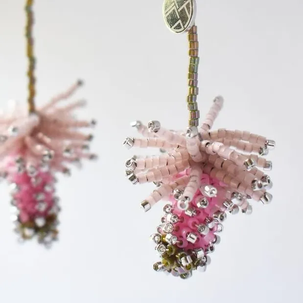 日当たりのよい場所に多く お盆過ぎごろに花の穂を出すツルボ 細長く伸びる花茎の先に うすい小豆色の小さな花を 長い円錐状の穂先にぎっしりとつけます 開いた花は 線香花火のような形状のものが群生して咲き 思いにふけりながら眺めるほどに 美しい植物です material SILVER925(ピアス金具)、SILVER925 ロジュームメッキ(イヤリング金具)、ガラスビーズ、銀糸、真鍮、チタン、フェルト、シリコン *シルバービーズはパラジウムメッキ加工を施したものを使用しております *取り付ける金具によって、使用している金属が異なります size 約26x58mm weight 約3.1-4.1g *取り付ける金具によって、重さが異なります *CACICOの商品は全て1点1点制作しているため、個体差があり、商品写真と差がある場合がございます。ご了承の上、ご購入ください。 *金属アレルギーの方はご使用をお控えください *受注生産のため、ご注文確定後1週間〜10日以内に商品を発送いたします