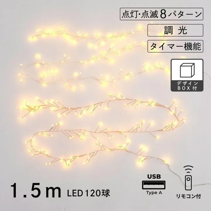 窓辺に垂らしたりガラスに詰めたりと色々なアレンジを楽しめるLEDライト商品の説明 人気の1.5mLEDライトに、USBタイプが新登場。電池の消耗を気にせず、お使いいただけます。ワイヤーは好きな形に曲げられるので、ツリーに飾ったり、窓辺に垂らしたり、ガラスに詰めたりと色々なアレンジを楽しめます。 素材の情報 火事の心配がなく、小さなお子さまやペットがいるご家庭でも安心してご使用いただけます。USBケーブルをUSBポートに差し込み、電源スイッチ、もしくはリモコンでON・OFF・点灯パターンの切り替えが可能です(8パターン点灯機能付き)また、調光、タイマー(6時間後に消灯し、18時間後に点灯)付きですので、お好みの明るさや、切り忘れの心配もありません。電池式とは違い気兼ねなく長時間使用する事ができます。 営業のひと言 完売必至の人気アイテムです。クリスマスはもちろん、一年を通してディスプレイやインテリアのアクセントになるアイテムです。