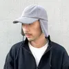 細めのリブ生地にボアの耳当てを付けたキャップ。耳当てを留める紐は柄の入ったドローコード。耳当ては後部もすっぽり隠れるサイズ感。