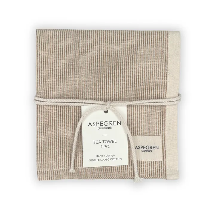 食卓に、時代に左右されない上質さを。 オーガニックコットンを100%使用し、丁寧に織り上げたティータオルです。 柔らかさと耐久性を兼ね備えた生地は、吸水性も抜群。繰り返しお洗濯しても、その風合いを損なうことなく長くご愛用いただけます。 清潔感のあるナチュラルな雰囲気のティータオル、どんなキッチンにも自然に馴染みます。 食器拭きとしてはもちろん、カゴの目隠しや、キッチンを明るく彩るインテリアのアクセントとしても◎ ティータオルにはループが2カ所付いています。 キッチンの高さにあわせて縦・横選んでかけられます。 飽きのこないシンプルなデザインなので、引っ越し祝いなどにもオススメです。 環境に配慮したAspegrenのティータオルはプラスチックは使用していません。