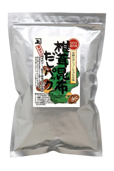 ーーー 【送料に関して】 商品合計が「60袋以上」もしくは「2ケース以上」で送料は弊社負担となります。(北海道・沖縄は除く) ーーー 国産の椎茸と昆布だけを使って作った、食塩・エキス・調味料など味付けをしていない素材だけの無添加だしパックです 動物性タンパク質不使用でビーガンやマクロビの方にもオススメします。 ※破っても使えますが、椎茸の粗い粉が入っていることがあります ●栄養成分(1パック7g中) 熱   量:12.2kcal タンパク質:1.2g 脂   質:0.22g 炭 水 化 物:4.41g ナトリウム:40mg 食塩相当量:0.1g ●お子様、お年寄りの人にも安心してお召し上がりいただける安心の国産だしパック カネジョウのだしパックは無添加・うま味調味料不使用・食塩不使用・化学調味料・砂糖不使用・食品添加物不使用・人工甘味料不使用で100%国内産。 酵母エキスやタンパク加水分解物、増量剤として使われるデンプン分解物も使用していません。 食塩不使用のため減塩調味料としてもお使いいただける「和風だしパック」。 パックを破ってそのまま粉末だしとしてもお使いいただけます。 体に優しい無塩だしはミネラルもたっぷり入っています。 ・化学調味料不使用 ・お子様も安心して飲めて安心安全 ・パックを破っても使える微粉末だし ・1パックで約4~5杯のお味噌汁ができます ・減塩調味料として。味噌汁1杯で0.05g以下の食塩量 ●当店のだしパックの包材は? 当店のだしパック包材には不織布を使用しています。 煮熟しても問題が無いという検査結果が出ているものを使用しています。 よく無漂白紙などの環境によさそうな素材を使用しない理由を聞かれます。 確かに無漂白紙の方が安いためメリットがあります。 しかし当店では下記の理由から使用をしていません。 だしパックは熱蒸着で封をしています。 不織布は熱蒸着で圧着が可能な素材ですが、無漂白紙などは素材自体の特性で高温で圧着しても封ができません。 そのため、熱を加えて封ができるようにノリを使用しています。 以前、不織布と無漂白紙でだしパックの味比べをしたところ、味が全く異なることがわかりました。 無漂白紙の場合、味が変異してしまうのです。 そしてそれは、封をするために必要なノリが煮熟すると溶け出してしまっていることが原因ということがわかりました。 そのノリは試験の結果、人体に影響はないから使われていると思われます。 しかし、包材の影響で味が変異してしまっては、良い素材を使っても全く意味がありません。 そのためカネジョウでは、素材本来の美味しさを味わって頂くためにも、無漂白紙を使用せず、不織布を選んで使用しています。 もし不織布が気になる方は、パックを破って粉末だしとしてご使用ください。