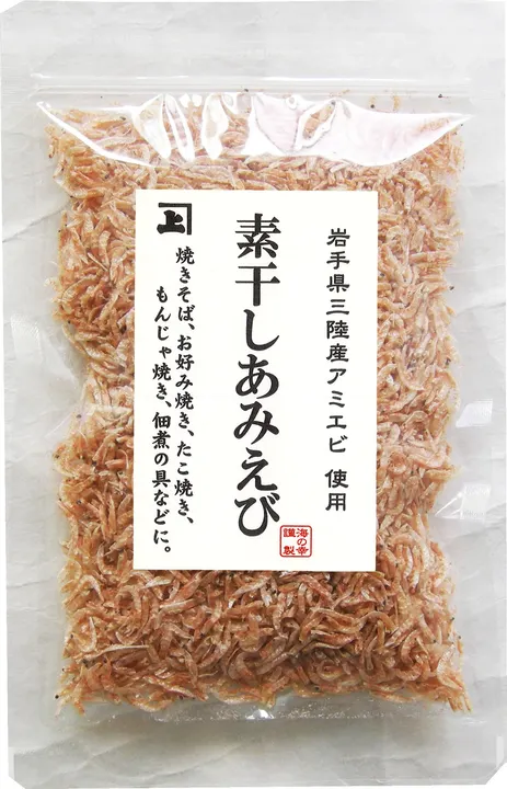 ーーー 【送料に関して】 商品合計が「60袋以上」もしくは「2ケース以上」で送料は弊社負担となります。(北海道・沖縄は除く) ーーー 海の栄養をたっぷり含んだ自然食品です。 着色料は使用していない自然な色で、そのまま食べても美味しいと評判です。 高たんぱく質、高カルシウムなどをはじめ、オメガ3やアスタキサンチンなど貴重な栄養素も含むとてもめずらしい乾物として注目を集めています。 【使いやすい!】 当店の「素干しあみえび」はしっかりと乾燥されています。 ですのでそのまま食べても香ばしく、何にでも入れてお使い頂けます。 味噌汁、サラダ、ご飯、パスタ、炒め物などなど幅広くオススメです。 オリジナルのレシピも一緒にお送りできます! 【「干し」と「素干し」の違い】 一般的に多く流通している「干しあみ」と呼ばれるものは、一度塩ゆでしています。 そのため塩分が多くなるとともに、オメガ3やアスタキサンチンなど高温に弱い栄養素が流れて出てしまっています。 それに対してコチラの「素干しあみえび」は生のまま、そのまんま乾燥させています。 ですので、栄養ももれなくしっかりと残っているという特徴があります。 【栄養たっぷり!】 素干しあみえびは天然の栄養たっぷりな食材です。 高タンパク質、高カルシウムをはじめ、オメガ3やアスタキサンチンなど貴重な成分を含んでいる珍しい乾物です。 特にアスタキサンチンは最近の注目度も急上昇中! 強い抗酸化作用があり、肌の保湿・バリア機能の維持、眼精疲労の軽減や、疲労回復、血流改善、血圧や悪玉コレステロールの抑制などがあると言われています。 ですので、年間を通して「旬の食材ととっても簡単な食べ方」という組み合わせでご案内して頂くことで、その使いやすさと栄養豊富という側面からも年間商材として大活躍してくれるのではないでしょうか。 ●栄養成分(100g当り) 熱   量:354kcal タンパク質:74.4g 脂   質:4.6g 炭 水 化 物:5.0g 食塩相当量:2.77g カルシウム:1860mg アスタキサンチン:7.59mg DHA:820mg EPA:1010mg
