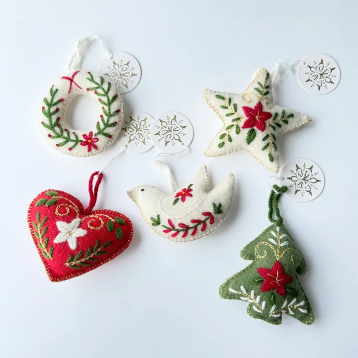 クラシック&シンプルにクリスマスを。 フェルト生地にやさしいハンドステッチが光る、クリスマスオーナメントの5点セットです。 ・リース ・ハート ・バード ・スター ・ツリー 裏側は無地です。 ペルーの地方に暮らす女性たちが手作りしています。 ■素材:ウール ■サイズ:縦・横巾 約10~12cm ■お手入れについて 丸洗いはできません 【注意事項】 全て手で作成する工程を含むため、サイズが若干異なる可能性がございます。 記載されているサイズはおおよその目安として参考にしてください。