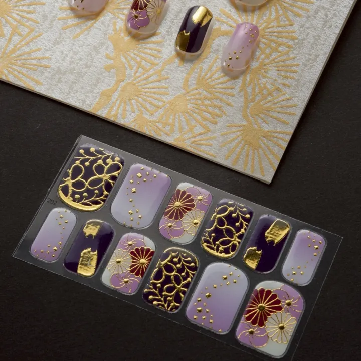 美しさに秘められた願いを指先に。古来より菊の文様は長寿。無病息災、邪気払いの象徴として愛されてきました。 紫を基調に、繊細な菊の花が浮かび上がる優美なデザイン。 まるで絹の着物を纏ったような気品がありながら、貼るだけで簡単に完成します。上質な紫とゴールドのデザインが特徴です。自宅で手軽にサロン級の仕上がりを実現でき、簡単に貼り付けられるため、忙しい方にも最適です。 爪にやさしい素材で、ダメージを気にせず楽しめる。 日常を少し特別な一日にしてくれます。 今日1日を特別な気分で過ごして下さい。 【使用方法】 ①1セットにパーツ12枚入りです。シールをドライヤーなどで温めると密着しやすくなります。、爪の油分を拭き取ってから、ご自分の爪よりひと回り小さいサイズのシールを選びます。 ②フィルムをそらし、なるべくピンセットなどを使用しシールを触らないように、シールをゆっくり丁寧に剥がします。 ③空気が入らないように、シールを爪に密着させます。 ④余分な部分を切り離します。爪よりシールが長くならないように斜め45度の角度で整えると自然に仕上がります。 ⑤本商品は長期間のご使用を想定しておりません。 仕上げにトップジェルを爪先のエッジとシールよりひと回り大きく塗って固めると仕上がりが良くなります。 【使用後】 剥がす時は爪表面に傷がつかないようにお湯につけてゆっくり剥がしてください。