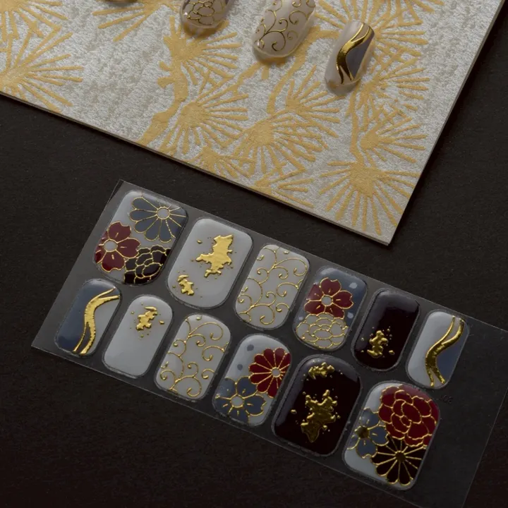 菊の花は、高貴、高尚、長寿、邪気払いなどの意味があります。一方、蔦には生命力の強さを表す意味合いが込められています。絹の着物を纏ったような気品がありながら、貼るだけで簡単に完成します。 贅沢に金の彩を使用したデザインが特徴です。自宅で手軽にサロン級の仕上がりを実現でき、簡単に貼り付けられるため、忙しい方にも最適です。 美しさに秘められた願いを指先に。 爪にやさしい素材で、ダメージを気にせず楽しめる。 日常を少し特別な一日にしてくれます。 今日1日を特別な気分で過ごして下さい。 【使用方法】 ①1セットにパーツ12枚入りです。シールをドライヤーなどで温めると密着しやすくなります。、爪の油分を拭き取ってから、ご自分の爪よりひと回り小さいサイズのシールを選びます。 ②フィルムをそらし、なるべくピンセットなどを使用しシールを触らないように、シールをゆっくり丁寧に剥がします。 ③空気が入らないように、シールを爪に密着させます。 ④余分な部分を切り離します。爪よりシールが長くならないように斜め45度の角度で整えると自然に仕上がります。 ⑤本商品は長期間のご使用を想定しておりません。 仕上げにトップジェルを爪先のエッジとシールよりひと回り大きく塗って固めると仕上がりが良くなります。 【使用後】 剥がす時は爪表面に傷がつかないようにお湯につけてゆっくり剥がしてください。