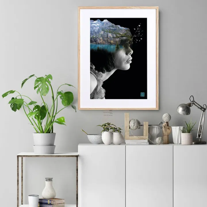 アーティスト -PROFILE- 藤本 麻弥 / Maya Fujimoto(マヤ フジモト) 2000年よりスペインの国境付近のフランス在住 リゾート地の観光局で広告デザイン全般を担当 人の価値観を変える事、さまざまな色や形で溢れ出る感情や世の中の傷、 生きる歓喜と哀しみのようなメッセージを表現したいと思っている。 主に雑誌の切り抜きや折り紙を使ったアナログコラージュ、 フォトショップを使ったデジタルコラージュを世界に発信する。 【作品について】 女性の頭には美しい景色が浮かび上がる。 白い鳥が飛び立つ、神秘的で幻想的なコラージュアート。 作品名:montagne 手法:写真、デジタルコラージュ ペーパー:高品質半光沢紙 マットカラー:白 マット*:DXホワイト芯 100%バージンパルプ/PH7・中性紙(2mm厚) ※全てのアートにマットがつきます フレームカラー:黒、白、無垢(3種類から選択) ※マット付のため通常とはフレームサイズが異なる規格となります。 【マット*とは?】 アートポスターの周りに挟んだ厚紙の事。 マットを使わない時に比べ余白により広がりが生まれ、作品の新たな一面を引き出せ作品の見栄えがグッと良くなります。また、額縁のガラス面と作品が直接触れたままにしておくと、くっついて作品を傷つけることがあります。マットを使用することでガラスと作品の間に空間ができ、作品を保護することができます。ブランドコンセプトにより全てのアートにマットがつきます。 ー ファッションのようにアートを ー 私達が掲げるコンセプトです! 毎日着替えるファッションの様に、アートも気軽に飾り変えて欲しい... 一旦飾り終えたアートにも光を当ててほしい... ポスター単体、またはリピートで中身だけのポスターを購入された方に"専用のハンガー"をセットでお届け。 「今までに無い!新しいアートの飾り方を提案」 飾る事がなくなった前のアートをハンガーにかけて洋服と一緒にかけてもらう。 その日の気分や、モチベーションですぐに取り換えられる様に。 もちろん、魅せる収納としても今までにないおすすめの飾り方です。