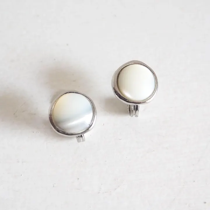 イヤリング【Modern】/マザーオブパールカボッションイヤリング クリーンなヴィンテージテイスト薫る シルバーカラーのコレクション ラフなスタイリングが映えるシーズンは アクセサリーもいろんな素材やカラーに挑戦できて、装う楽しみが湧き立ちますね。 少しカジュアルなコーデのときにも、きちんと見えするアクセサリーが耳元に光ると 何だかとっても安心できるし自信が持てるもの。 こちらのコレクションでは クリーンなシルバーカラーと天然素材との異素材MIXのアイテムでありながら ナチュラルに偏らずきちんと見えも叶ってしまう、イヤリング&ピアスが揃います。 ロジウムメッキによる落ち着きあるトーンのシルバーカラーと、天然素材の淡水パールやシェルの美しい輝きを活かし Oucaらしいヴィンテージテイストもしっかりと織り交ぜました。 特徴あるカラーや素材のテイストでも、これならオールシーズン手にとれる! そんな普遍的な魅力もプラスした、新鮮なシルバーカラーのアイテムたちです◎ ////////////////////////////// 天然素材 「マザーオブパール」の魅力 ////////////////////////////// 今回メインの素材として用いたのは 「マザーオブパール」と呼ばれる真珠をつくりだす母貝。 母貝にはいろいろな種類があることからマザーオブパールにも様々な色調が存在します。 パールのような美しい照りと光沢があり、透明だったり模様の斑だったり。 幾重にも重なる層が一つ一つ異なる表情で輝きます。 その柔らかなトーンの乳白色は上品でナチュラルな雰囲気も併せ持ち、 アクセサリーやジュエリーだけではなくボタンや時計の装飾などの日用品としても用いられています。 親しみある雰囲気の中にも、アクセサリーならではの美しさや特別感を丁寧に散りばめて、 ヴィンテージらしい面持ちもしっかりとプラスしながら仕上げました。 ◆詳細◆ 滑らかで美しい曲線を描くカボッション型に加工したマザーオブパールを用いた、オリジナルモチーフのイヤリング。 厚みや形をラフに崩しながらボリュームを持たせて仕上げたオリジナルの石枠と組み合わせ、シンプルにシェルをおさめました。 落ち着きのあるシルバーカラーの艶やかな石枠は幾重にも重なる層で構成されたシェルをやさしく包み込み、 程よく輝きを添えながら引き立て役となってくれています。 シェルの径は10mmほど、石枠を含め13mmほどとしっくりと耳元に収まるコンパクトなサイズ感。 イヤリング金具もほぼ隠れて、デイリーに気負わず身に着けていただけます。 こちらのアイテムで使用したのは「高瀬貝」という種類の、真珠の核にも使われるマザーオブパール。 落ち着いたオフホワイトの優しい色味で、白蝶貝よりも控えめな光沢が美しさを引き立てます。 金具はクリップタイプ。 シリコンカバーも装着しやすく、快適にお使いいただけます。 商品には専用のBOXが無料で付属しますので、ギフトにも最適です◎