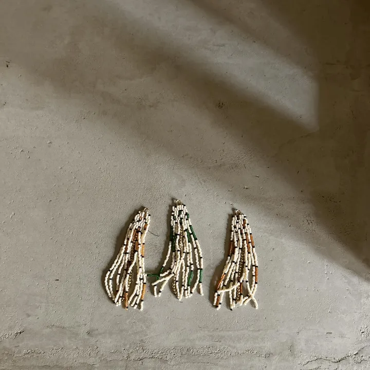 《アソート受注生産》 マットなカラーと少し透けたようなビーズをミックスしてスリムなフリンジタイプ ベースのカラーはきなり色 アクセントカラーに茶色、明るい茶色、グリーンでお作り致します。 繊細なビーズを使用しているのでお取り扱いはご注意ください。 発送についてーーーーーーー 一つ一つ手作業の為ご注文数と時期により完成のお時間に違いがあります。お急ぎの場合は事前にご相談ください。