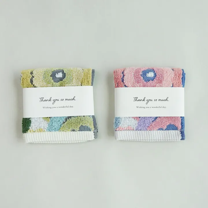 今治の「thank youハンカチタオル」 北欧カラーを思わせる柔らかい色使いの、ふんわりと咲くお花柄のハンカチタオルです。 大きく描かれた大輪のお花が優しく咲き誇るデザインは、まるでアートのようで手にする度に心が癒されます。 今治の職人が丁寧に織り上げた良質な1枚は、大切な方へのギフトにぴったりです。