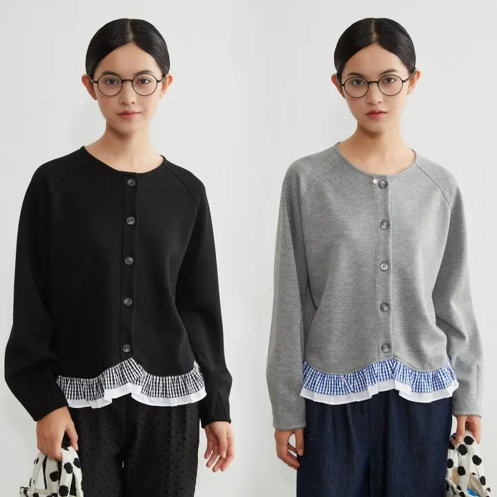 特徴 裾にあしらわれたチェック柄のフリルが女性らしさを添えるショート丈のカーディガン。コンパクトなシルエットでバランスよく、羽織るだけでスタイリングの主役に。袖口もダーツ入りの仕様で立体感が◎。 生地 ハリ感と柔らかさを兼ね備えたダンボール素材を使用。立体感がありつつも軽やかで、シワになりにくくデイリー使いにぴったりです。 コーディネート提案 ハイウエストボトムやワンピースと合わせれば、スタイルアップ効果も◎。シンプルなインナーと合わせてチェック柄を引き立てる着こなしがおすすめです。 単位(cm)モデル身長167cm サイズ FREE  着丈 55 バスト 112 裄丈 78 素材:レーヨン50%、ポリエステル45%、ポリウレタン5% 別布:綿100% 中国製 透け感:なし 生地の厚さ:普通 光沢感:なし 裏地:なし 家庭洗濯:可能 【注意点】 ※撮影商品はサンプルの為、実際の仕様と異なる場合がございます。 ※画像の商品は光の照射や角度、お使いのモニター環境により、実物と色味が異なる場合がございます。スタジオ物撮りの画像が実物の色味に一番近くなっております。 ※予約商品の場合、お届け予定はあくまでも目安となります。 生産の都合上、お届け時期がずれる場合がございますので、あらかじめご了承ください。 ※表記サイズは商品の実寸です。 ※布製品の特性上、サイズ表の実寸法は多少の誤差が生じる場合がございますので、予めご了承ください。