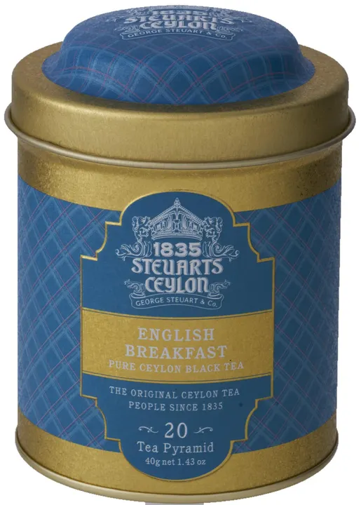 茶葉が動き抽出しやすいトライアングルバッグです。 1缶のなかに10個入りの袋が2袋入った合計20個。 高級感のある缶入りで、ギフトにもおすすめの商品です。 ※こちらの商品はギフトボックスはついておりません。 ギフトボックスご希望の方は、  バリエーションからギフトボックスをお選びいただき、別途ご注文下さいますようお願いします。  (ギフトボックスには2缶入ります) 【ENGLISH BREAKFAST (イングリッシュブレックファスト) フレーバー紹介】 スリランカのディンブラで生産された高級茶で、 フレーバーティーのような柑橘系の香りと深い味わいが特徴です。 色は気品溢れる黄金色。カップに注いだ時、光の反射の影響で水面に金色の輪が できることがあり、これを「ゴールデンリング」と呼びます。 強い香りが苦手な人は、ミルクティーにするのもおススメです。 ペアリング:ハード系のパンやデニッシュパン、カスタードシュークリーム、 食事・デザートどちらにも◎ ミルクティー、アイスティーにもおすすめ 【内容量】40g(2g×10袋×2) 【原材料】紅茶 【お届けの状態】常温 【アレルゲン】なし 【賞味期限】製造から3ヵ月以上 【原産地】スリランカ (スリランカ産茶葉100%使用) <George Steuart Tea(ジョージスチュアートティ)とは> George Steuart は、1835年に英国人船長James Steuartによって設立された、スリランカ(前セイロン)で最も歴史の古い紅茶メーカーです。内戦前はセイロンという国名だったスリランカ。スリランカでピンと来ない人も、「セイロンティー」は聞いたことがあるのではないでしょうか。英国からの独立後も紅茶文化は残り、国策として茶園国有化まで計画され、同社もその計画に深く関わっています。「インド洋の真珠」と謳われるほど美しく肥沃な土壌は、茶園を作るのに最適だったのです。180年以上を経た現在でも、手摘みの伝統的な技法で作られる同社の紅茶ですが、現代の嗜好に合わせて少しずつ新しいフレーバーを開発。革新的な老舗として世界中で愛されています。日本では、2014年、当時の在日スリランカ大使の推薦もあって正規販売が始まった、まだ新しいブランドです。 <George Steuart Teaが選ばれる理由> George Steuart Teaは、英国女王陛下に献上し感謝状をいただいたこともある、格式高い紅茶です。スリランカ産の茶葉を100%使用し、伝統的技法で一貫製法されています。一方で、現代人のスタイルに合うよう、リーフ以外にもトライアングルバッグ、気軽に試せるティーバッグなど、多数ご用意しています。フレーバーも、定番からオリジナルまで20種以上と多様。必ず好みのフレーバーが見つかるラインナップです。また、香りも風味もフレッシュなので、ストレートはもちろん、アイスティーやミルクティーでも美味しくいただけます。 日本での販売が始まってわずか2年で、ANAのビジネス・ファーストクラスに搭載、さらに翌年にはANAの全てのラウンジにも採用され、着実にファンを増やしています。