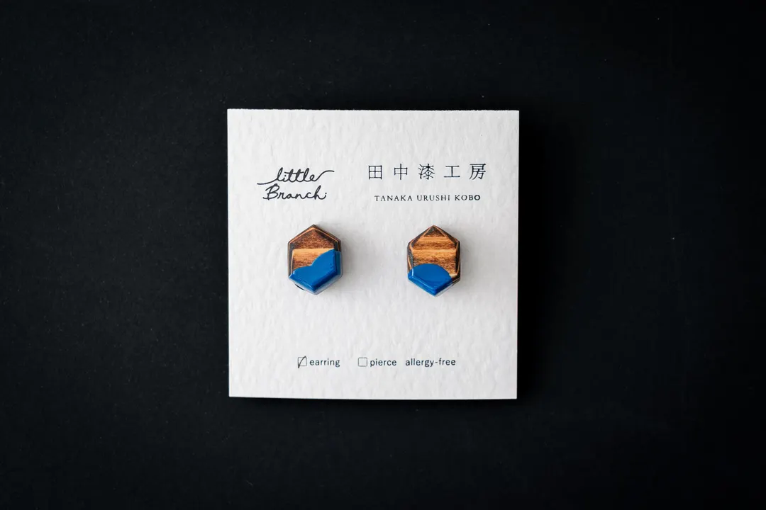 木と漆のアクセサリー solid六角形 青 ピアス