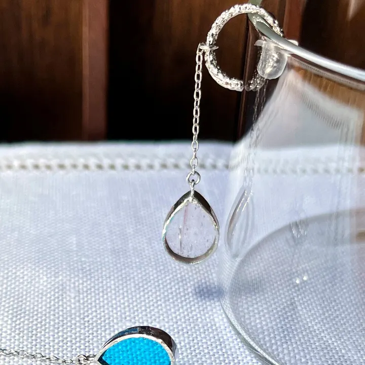 軽くて着け心地の良い片耳用イヤーカフです。 軽やかに揺れる細いチェーンが繊細な印象です。 無色透明に見える淡いピンク色のガラス。小粒でコロンとしたしずく形です。小さな気泡やスジが入る質感が爽やか。 半田部分は銀色に輝きます。 耳たぶを引っ張るようにして上側の薄いところから差し込み、耳の真ん中あたりまで下ろしてください。 イヤーカフはゆっくり広げたり狭めたりしてサイズ調整ができます。(強い力や繰り返しの調整は破損の原因となるためご注意ください) ◇Size: 約 1.0×1.4㎝(ガラス部分) ◇Weight: 約 1.3g ◇イヤーカフ: 真鍮 ◇キャッチ: ゴム ◇鉛フリーの半田を使用しています。