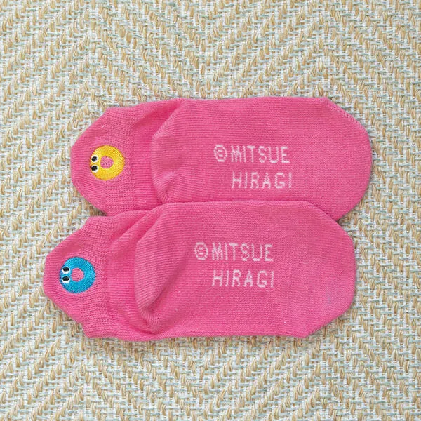 『お?かお!』『ころりん・ぽい!』(ほるぷ出版)などが大人気の絵本作家ひらぎみつえさん。「あかちゃんがよろこぶしかけえほん」シリーズはユニークな表紙の絵のインパクトだけでなく、あかちゃんの小さな指でも気持ち良く動かせるしかけと、その動きのおもしろさで、2016年の発売以来シリーズ全27作(2024年12月現在)累計300万部を突破! まさに親子で楽しめるあかちゃん向けしかけ絵本の新定番として定着しています。 絵本ナビでは、シリーズの中でも人気の4冊『お?かお!』『ころりん・ぱ!』『ころりん・ぽい!』『ぴったん・こ!』を「絵本ナビオリジナルグッズ」として制作。絵本の持つユーモラスな雰囲気と、しかけを動かした時のワクワク感を生かしながら、とびっきり愛らしい商品の数々が誕生しました。 こちらはキッズソックス。くりくり目玉のついたわっかの「ころりん」に指をのばし、くねくねした道を走らせるしかけ絵本『ころりん・ぱ!』。そのころりんの可愛い刺繍がワンポイントになったキッズソックスが完成しました! 『ころりん・ぱ!』の絵本をイメージするピンク、ブルー、グリーンの3色を基調に、左右それぞれ違う色と表情の「ころりん」が刺繍されています。靴をはいた時に、かかとのワンポイントが見えるデザイン。しっかりと履きやすい形になっているのも嬉しいですよね。 好きな色を選んでも、3色まとめて購入しても! レディースサイズもありますので、親子で揃えて履いて楽しんでください。絵本と一緒にギフトにもおすすめです。