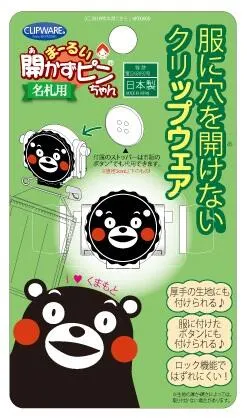 服に穴を開けない名札用留め具の定番商品「まーるい開かずピンちゃん」のくまモンサンリオバージョンです。 他のバージョンと同様にロックタイプですので、 比較的厚手の生地を裏表から挟んで留める方法と、 スモックなどの固めの生地なら縫い付けたボタンに留める 2ウエイ対応です。 ※国内販売に限ります。