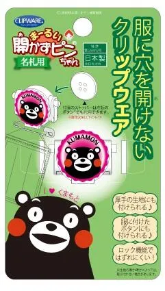 服に穴を開けない名札用留め具の定番商品「まーるい開かずピンちゃん」のくまモンサンリオバージョンです。 他のバージョンと同様にロックタイプですので、 比較的厚手の生地を裏表から挟んで留める方法と、 スモックなどの固めの生地なら縫い付けたボタンに留める 2ウエイ対応です。 ※国内販売に限ります。