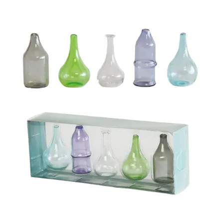 小さな、小さな5個セットのフラワーベース。 暖色、寒色、クリアと、好みに合わせてコレクションしたくなる可愛さ。 ミニサイズなので、場所を選ばずにどこにでも飾ることができます。 カラフルなのでまとめて飾るのはもちろん、1個ずつ様々な場所に飾る事でも楽しみが広がります。